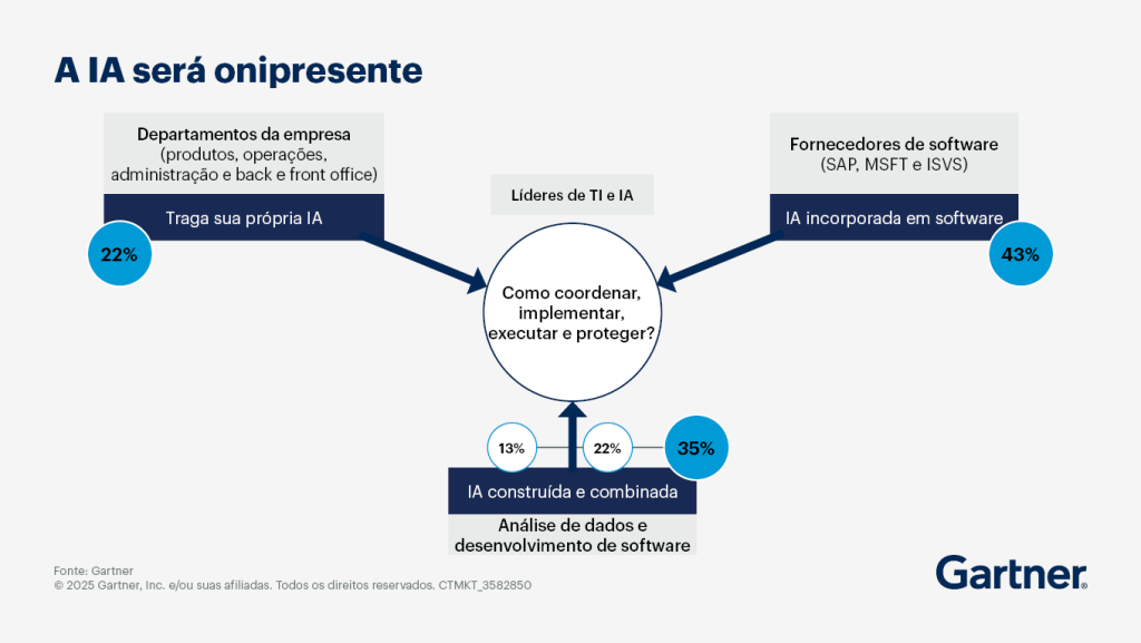 A imagem da Gartner que analisamos mostra, de forma clara, como a Inteligência Artificial está sendo adotada por múltiplas frentes dentro das empresas: ela vem dos fornecedores de software, emerge das áreas técnicas internas e também é trazida de forma autônoma pelos próprios departamentos de negócio. Com tanta gente “colocando IA na mesa”, surge uma questão inevitável: quem está coordenando esse ecossistema?