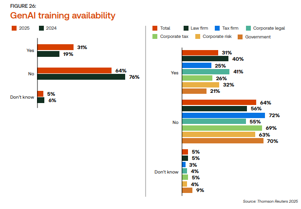 O número de organizações que oferecem treinamento em GenAI cresceu de 19% em 2024 para 31% em 2025. Embora esse avanço seja positivo, ele ainda deixa claro que a maioria das empresas (64%) continua sem programas estruturados de capacitação.