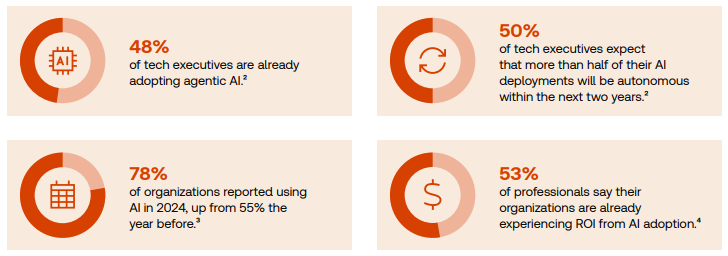 De acordo com a pesquisa apresentada, 48% dos executivos de tecnologia já estão adotando IA agente em suas organizações. Ou seja, não se trata mais de pilotos ou testes isolados: quase metade dos líderes do setor já estão operando com assistentes baseados em IA que interagem, processam, tomam decisões e escalam tarefas.