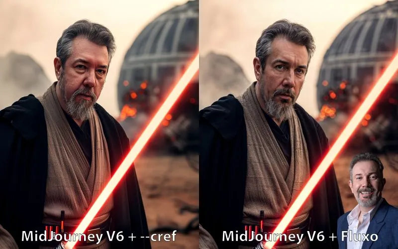 Do lado esquerdo esquerdo da imagem eu usei o MidJourney, que ainda é o benchmark para geração de imagens, onde usei um prompt bem estruturado e o Character Reference (feature que desenvolve boa consistência de personagens), mas como o pessoal mesmo do MidJourney diz, funciona melhor com personagens originários da própria ferramenta. De toda forma, algumas pessoas reportam bons resultados com personagens reais e eu já consegui também alguma coisa legal.