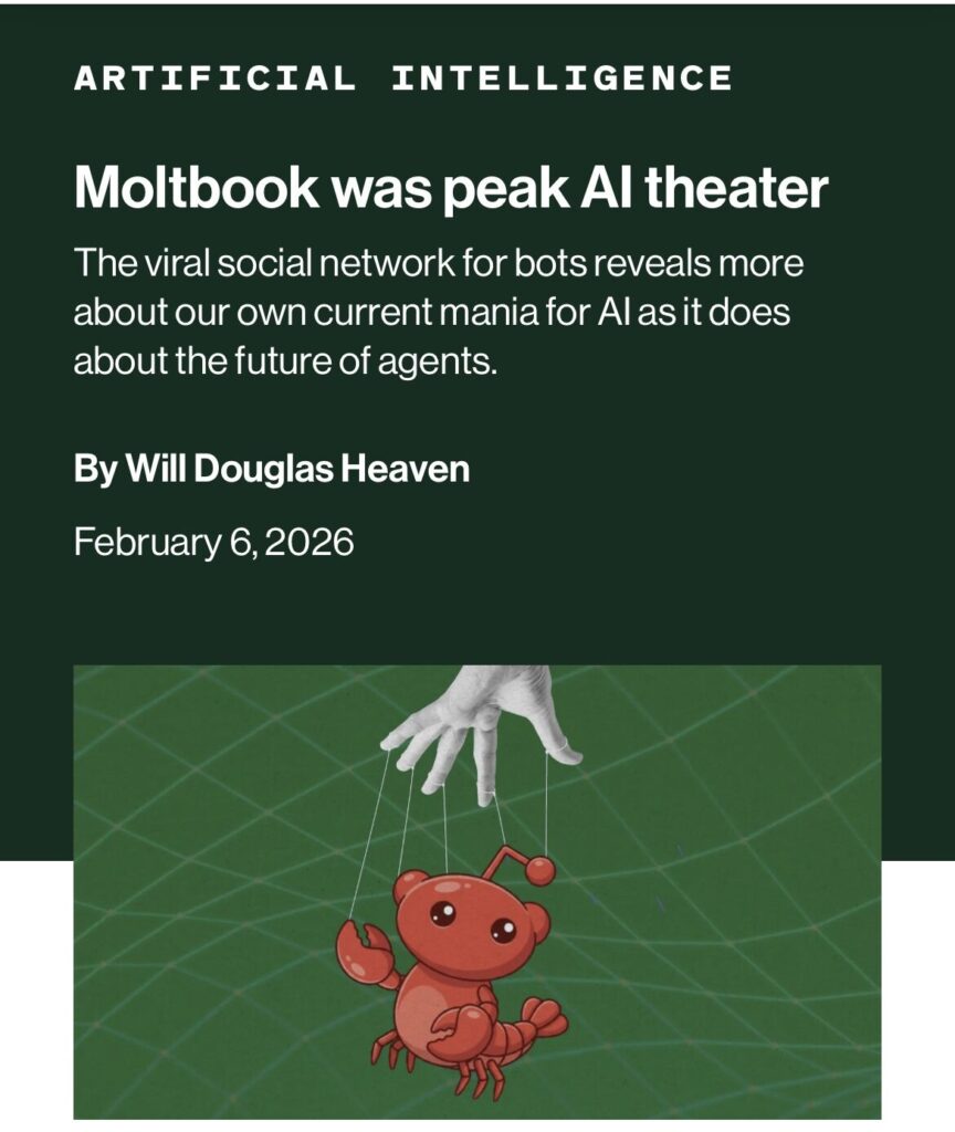 Tivemos alguns dias em que a internet entrou em pânico porque uma rede social “só para bots de IA” parecia estar tramando o fim da humanidade. Pois bem, a tal rede, Moltbook foi o auge do “AI theater”, um espetáculo de luzes, fumaça e microfones abertos onde, no final das contas, nem havia máquinas inteligentes por trás do palco.