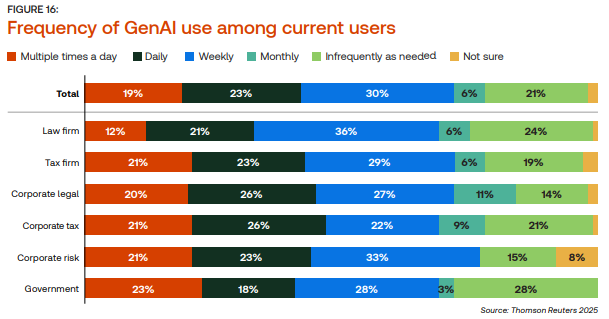 Entre os usuários do governo, 23% já usam GenAI várias vezes por dia, o que surpreende positivamente. No entanto, o índice de uso diário ainda é o menor entre os setores analisados (18%), e 28% usam semanalmente.