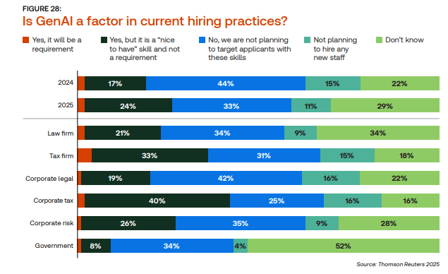 Os dados revelam que firmas de contabilidade e departamentos de tax corporate lideram o movimento. Em empresas desse perfil, 33% e 40% respectivamente já tratam o conhecimento em GenAI como um requisito de contratação. Isso se explica pelo volume de dados operacionais e pela capacidade da IA de reduzir o tempo em tarefas como análise tributária, cruzamento de informações e geração de relatórios.