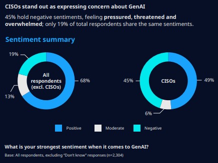 Segundo a pesquisa, 45% dos CISOs afirmam ter sentimentos negativos diante da GenAI. As emoções relatadas incluem pressão, ameaça e sobrecarga. Esse número contrasta fortemente com os 19% de respostas negativas entre os demais participantes da pesquisa.