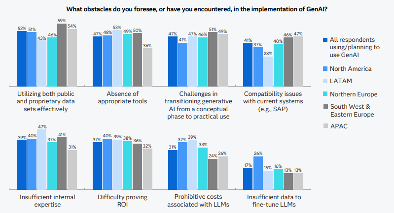 A maior barreira apontada é a dificuldade de usar dados públicos e proprietários de forma eficaz. Isso aparece como obstáculo para 52% dos respondentes, e em algumas regiões, como América Latina e Norte da Europa, chega a mais de 54%.