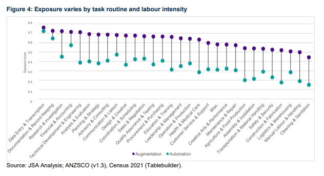 Engenharia, arquitetura, desenvolvimento de software e funções técnicas complexas aparecem com níveis medianos de automação e augmentação. Isso reflete o fato de que parte do trabalho pode ser automatizada (como testes, documentação ou simulações), enquanto outra parte exige criatividade, conhecimento tácito e tomada de decisão baseada em contexto.