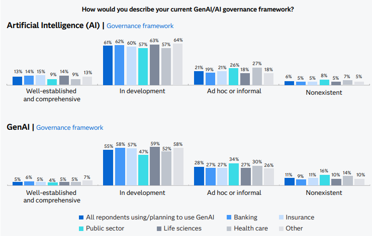 Tanto para IA quanto para GenAI, a maior parte das organizações se encontra na fase de desenvolvimento das estruturas de governança. No caso da IA tradicional, mais de 60% dizem estar com frameworks “em desenvolvimento”. No caso da GenAI, esse número gira entre 55% e 59% dependendo do setor.