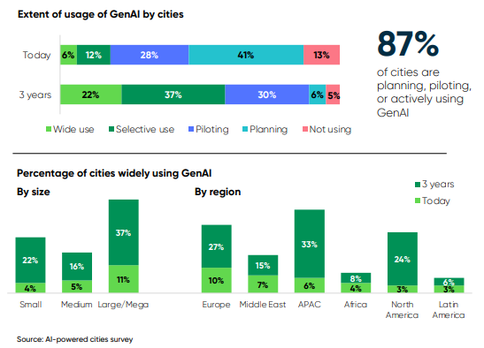 A análise por região mostra que, embora a adoção seja crescente globalmente, a velocidade e o nível de implementação variam. A Ásia-Pacífico (APAC) e a Europa se destacam com as maiores projeções de uso amplo da IA generativa nos próximos três anos, com 33% e 27%, respectivamente. Isso pode ser resultado de políticas públicas de incentivo à tecnologia, forte ecossistema de startups ou a necessidade de otimizar o planejamento urbano em regiões com rápido crescimento populacional. A América Latina e a África, embora com números menores, mostram um potencial de crescimento que reflete um interesse crescente em aproveitar a IA para o desenvolvimento urbano.