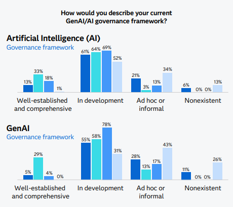 A porcentagem de empresas que afirmam não ter nenhuma estrutura de governança para IA é de apenas 6%. Para GenAI, esse número salta para 11% e, em alguns segmentos analisados, chega a 26%.