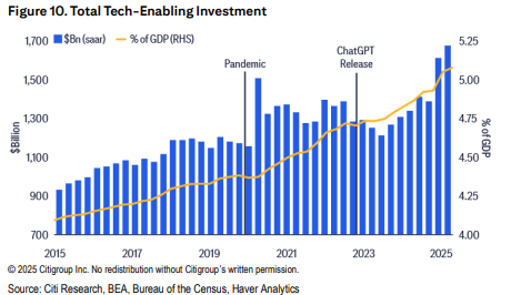 gráfico destaca marcos importantes, como o impacto da pandemia em 2020, que, contra todas as expectativas iniciais, acelerou a digitalização e, consequentemente, o investimento em tecnologia. Mais recentemente, a notável liberação do ChatGPT em 2022 surge como outro ponto de inflexão, sublinhando o papel cada vez mais proeminente da inteligência artificial generativa na pauta de investimentos. A curva ascendente do percentual do PIB dedicado a essas tecnologias é um testemunho da crescente importância estratégica que o setor ocupa na economia global.