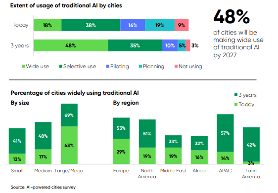 A adoção da IA não é uniforme em todas as cidades. O gráfico da esquerda, que compara o uso por porte de cidade, mostra que as metrópoles, classificadas como “Large/Mega”, lideram a adoção, com 69% projetado para uso amplo nos próximos anos. Isso se deve, em grande parte, à maior complexidade e aos desafios que essas grandes cidades enfrentam, como tráfego intenso e gestão de infraestrutura. No entanto, o gráfico também revela que as cidades de pequeno e médio porte estão alcançando o ritmo de adoção, o que demonstra que a IA está se tornando acessível e relevante para todos os tipos de centros urbanos.