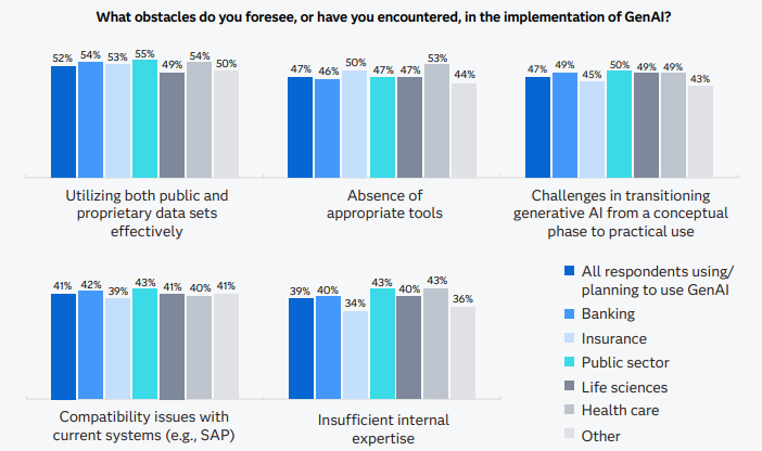 O principal desafio apontado pelas organizações é a dificuldade em utilizar dados públicos e proprietários de forma eficaz. Isso é especialmente sensível em setores como setor público e saúde, onde a governança de dados é complexa e o acesso a informações limpas, organizadas e seguras é um requisito para que GenAI funcione com precisão.