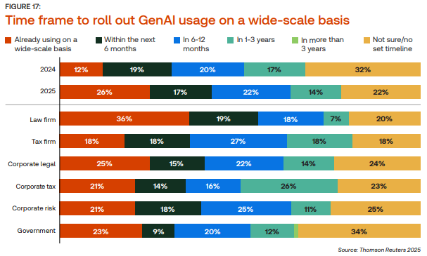Entre todos os setores avaliados, o setor jurídico se destaca. Em 2025, 36% dos escritórios de advocacia já utilizam GenAI de forma ampla. Além disso, outros 19% pretendem escalar a tecnologia nos próximos seis meses. A familiaridade com dados textuais e o ganho de produtividade em tarefas analíticas ajudam a explicar essa liderança.