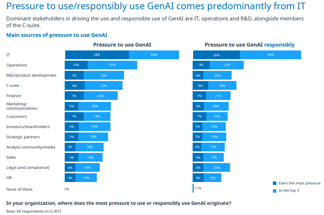TI aparece com força como principal agente de pressão tanto para o uso quanto para o uso responsável da GenAI. Mais da metade dos respondentes identificam essa área como uma das três maiores fontes de incentivo à adoção, e 26% dizem que é ela quem mais pressiona por uso responsável.