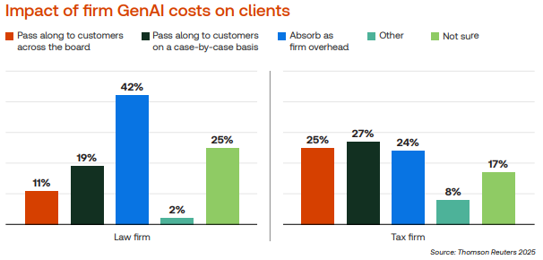 No entanto, o dado mais interessante é que 25% dos escritórios dizem absorver os custos como parte do seu próprio overhead, ou seja, considerando o uso da GenAI como um investimento interno, e não como um serviço cobrado diretamente do cliente.